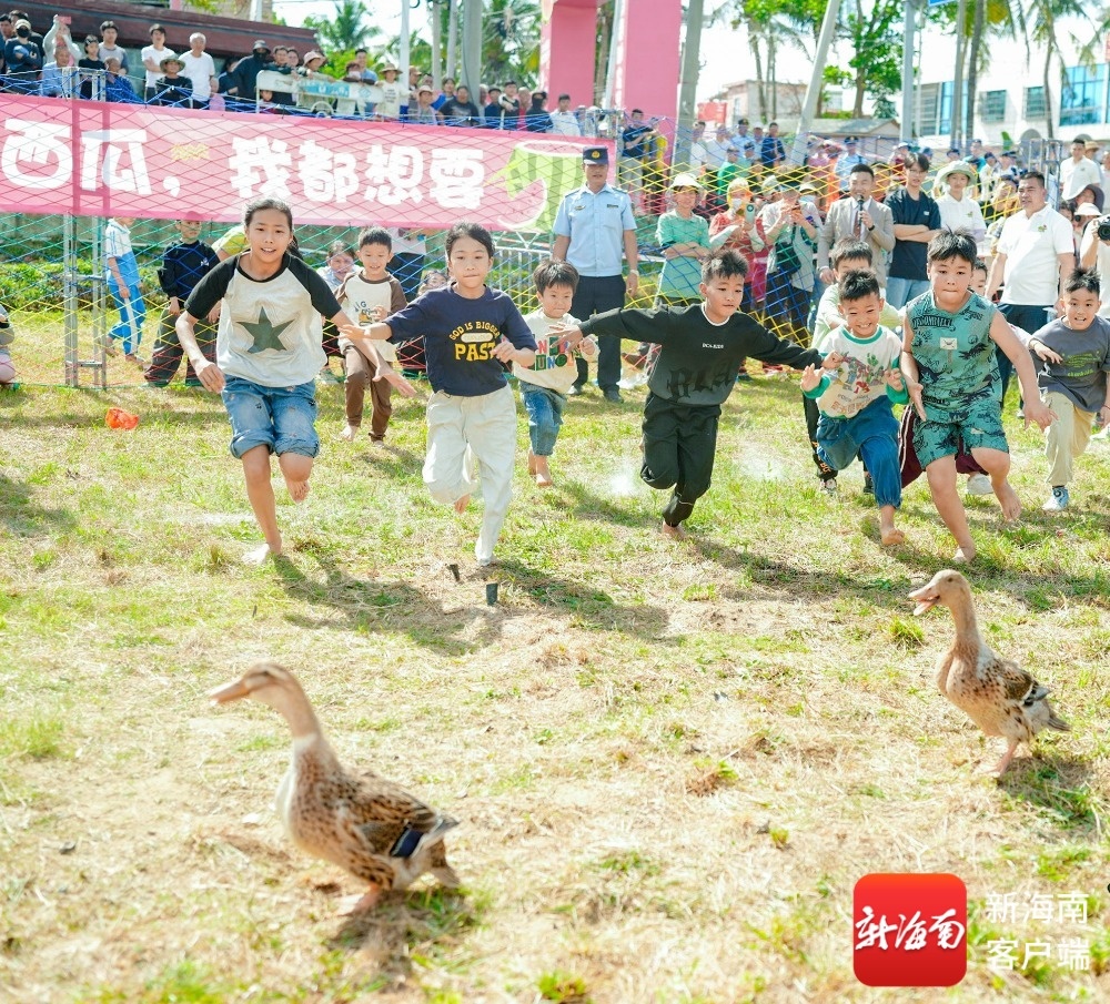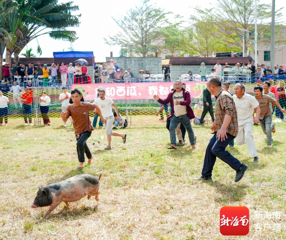 趣味互动环节“蒙眼抓鸭抓猪”。陵水黎族自治县委组织部供图