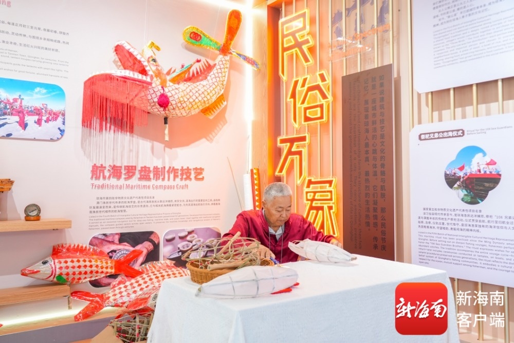 卢家炳带着竹条和工具,坐进了展馆里。他的展位不大,一张木桌前常常围了一圈人,好奇地拿着鲤鱼灯翻来覆去地看。“以前只在村里舞,过年的时候热闹一下。”作为老渔民,卢家炳对这片海有着深厚的感情。在潭门,鲤鱼灯闹春是延续了几百年的习俗。从正月初三开始,每当夜幕降临,各村便锣鼓喧天,一盏盏灵动的鲤鱼灯穿梭在村巷间,为家家户户送上新春祝福。