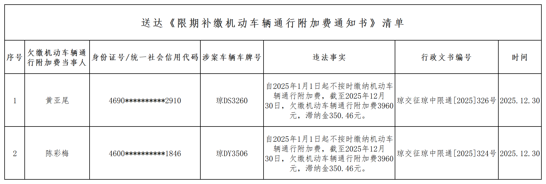 因下列欠缴机动车辆通行附加费当事人不按时缴纳机动车辆通行附加费(具体欠费信息详见附表一:送达《限期补缴机动车辆通行附加费通知书》清单),违反了《海南经济特区机动车辆通行附加费征收管理条例》第九条、第十一条的规定,根据《海南经济特区机动车辆通行附加费征收管理条例》第二十六条的规定,向下列欠缴机动车辆通行附加费当事人送达《限期补缴机动车辆通行附加费通知书》,限下列欠缴机动车辆通行附加费当事人在收到本通知书之日起十日内到本单位补缴应缴费额、滞纳金(两项具体金额以实际缴纳之日为准)。现因本单位采取其他方式无法向下列欠缴机动车辆通行附加费当事人送达《限期补缴机动车辆通行附加费通知书》,特依法予以公告送达,公告期为30日,请下列欠缴机动车辆通行附加费当事人自公告之日起30日内来海南省交通规费征稽局琼中分局领取《限期补缴机动车辆通行附加费通知书》,公告期满即视为送达。