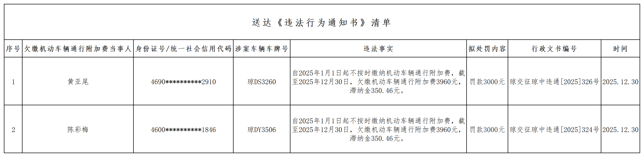 因下列违法行为当事人不按时缴纳机动车辆通行附加费(具体违法信息及拟处罚内容详见附表二:送达《违法通知书》清单),违反了《海南经济特区机动车辆通行附加费征收管理条例》第九条、第十一条的规定,本单位依据《海南经济特区机动车辆通行附加费征收管理条例》第二十六条拟对下列违法行为当事人作出行政处罚决定。现因本单位采取其他方式无法向下列违法行为当事人送达《违法行为通知书》,特依法予以公告送达,公告期为30日,请下列机动车辆车主自公告之日起30日内来海南省交通规费征稽局琼中分局领取《违法行为通知书》,公告期满即视为送达。