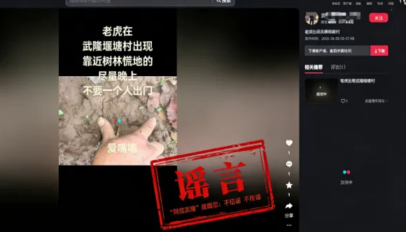针对网民发布的不实视频及爪印图片,武隆区网信部门第一时间联合区林业局、属地乡镇(街道)开展实地核查。林业专业人员对视频中爪印的形态、大小、分布等特征进行专业比对鉴定,确认该爪印为其他野生动物足迹,并非老虎爪印,同时武隆区境内未发现老虎活动的任何痕迹。截至目前,武隆区未接到任何关于老虎伤人、扰民,或发现老虎活体的报告,该视频内容系刻意编造、误导公众的虚假信息。