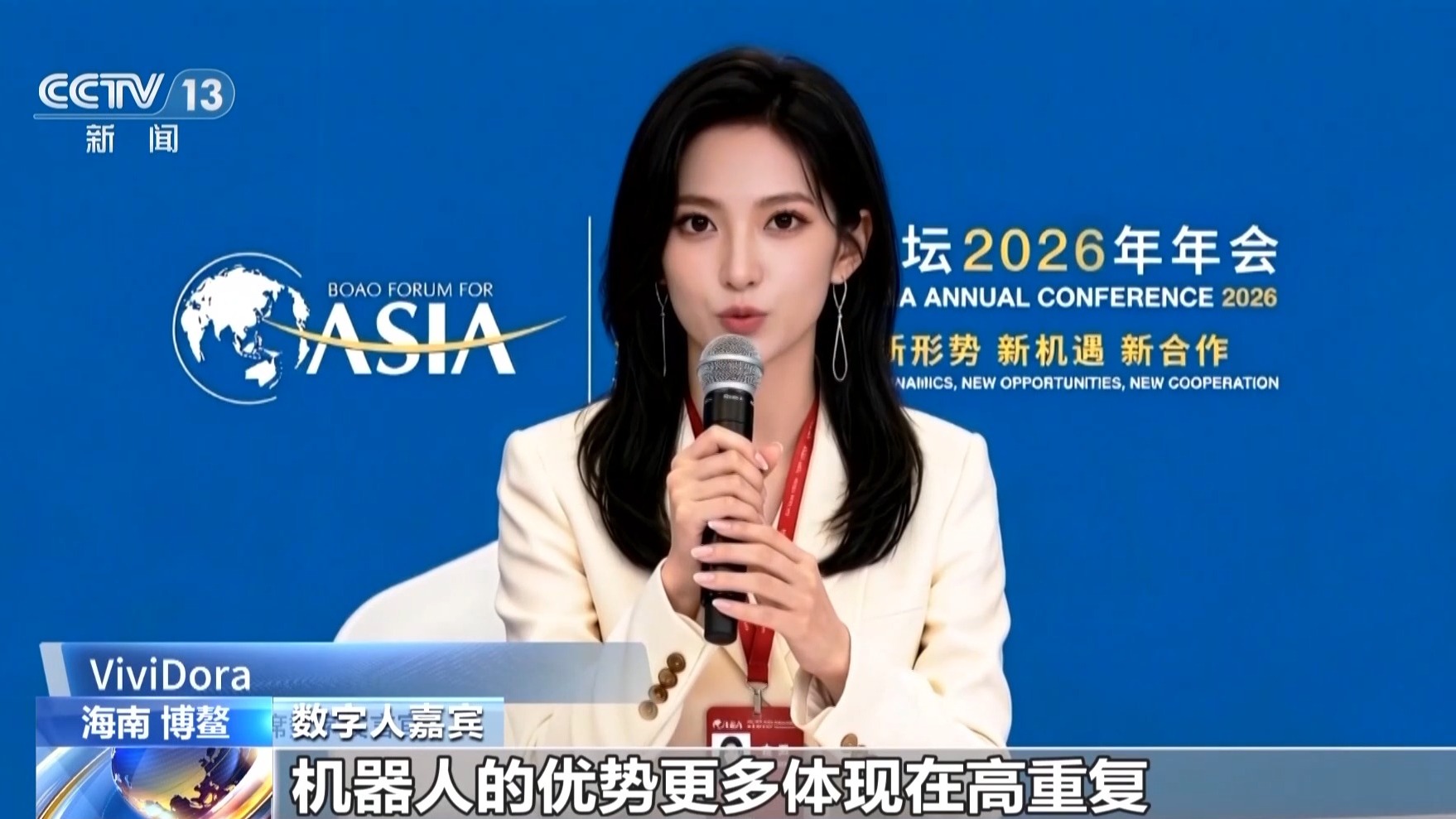 总台央视记者 张道峰:今年博鳌亚洲论坛上,这批格外亮眼的“新员工”,成了大家热议焦点。这场以机器人为核心议题的论坛,现场座无虚席,嘉宾阵容十分强大,既有外国前政要、海内外知名学者,更有人形机器人、数字人等特殊嘉宾共同参与这场前沿对话。