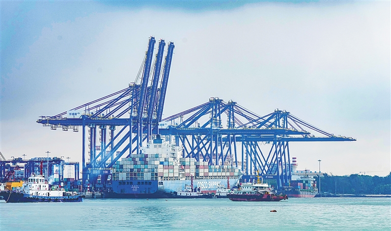 在洋浦国际集装箱码头,船舶往来、装卸货物,呈现出一派繁忙景象。海南日报全媒体记者 陈元才 摄