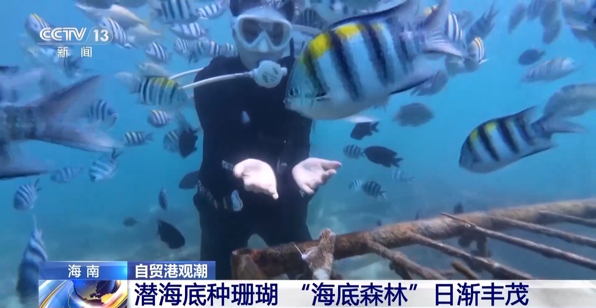 三亚蜈支洲岛珊瑚养殖负责人 王丰国:我们做珊瑚种植,是为了通过人工干预的方式来恢复海洋水下生态的平衡。
