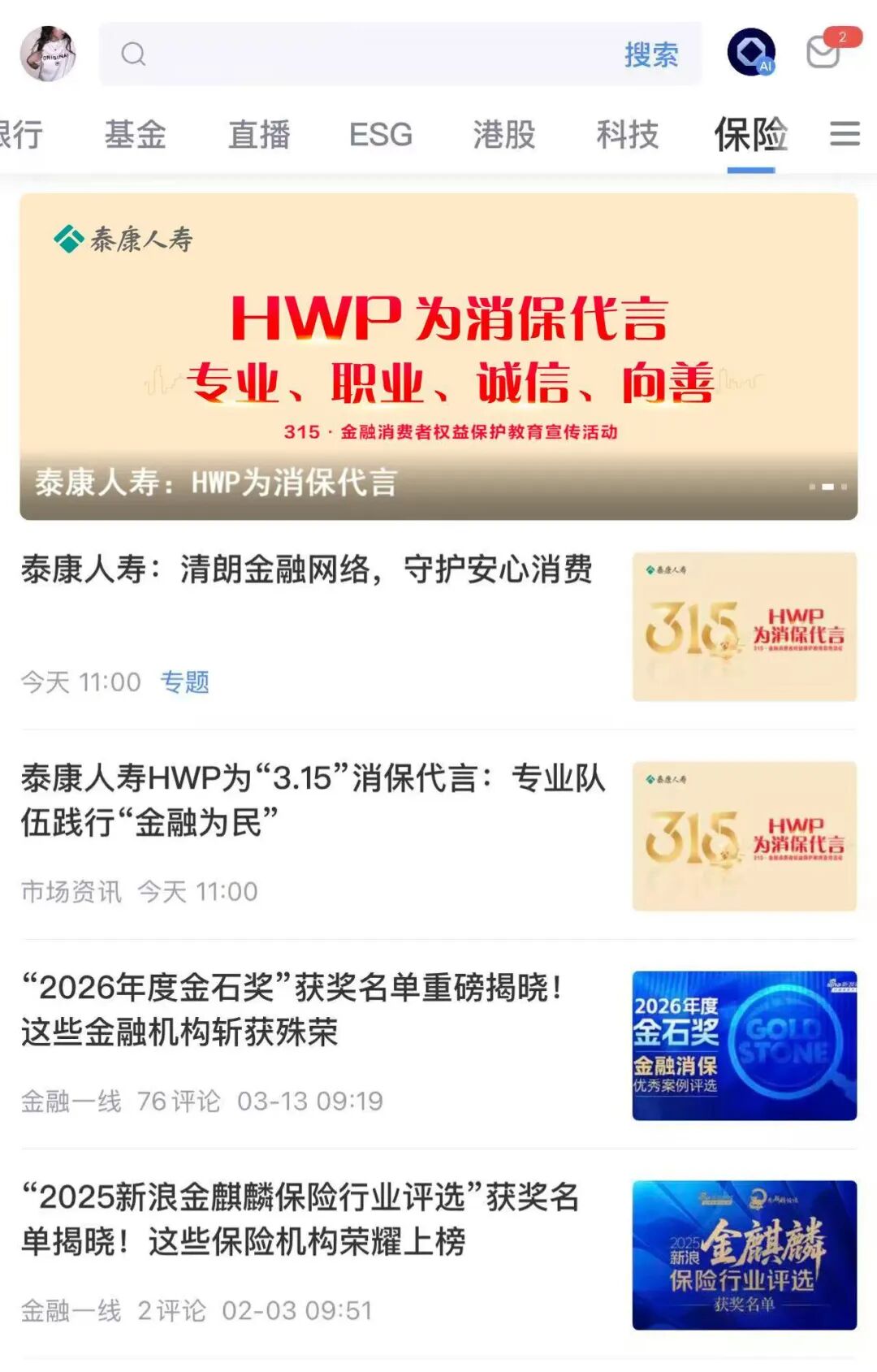 2026年3月“3·15”金融消费者权益保护教育宣传活动火热开展之际,泰康人寿组织健康财富规划师(HWP),积极参与消保宣传和服务,开展“HWP为消保代言”活动,上线新浪财经专栏,迅速点燃网络热度,上线5天累计曝光已超1500万人次,引发了广大网友的好评。