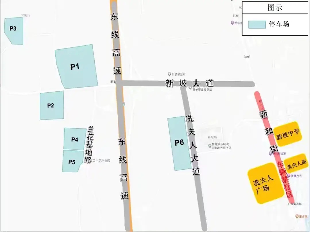停车区域:新坡镇共设置6个临时停车场,参加活动的车辆主要引导至P1、P2停车场停放,P1、P2停车场饱和后,再依序引导至P3、P4、P5、P6停车场停放,再乘坐摆渡车前往活动现场。