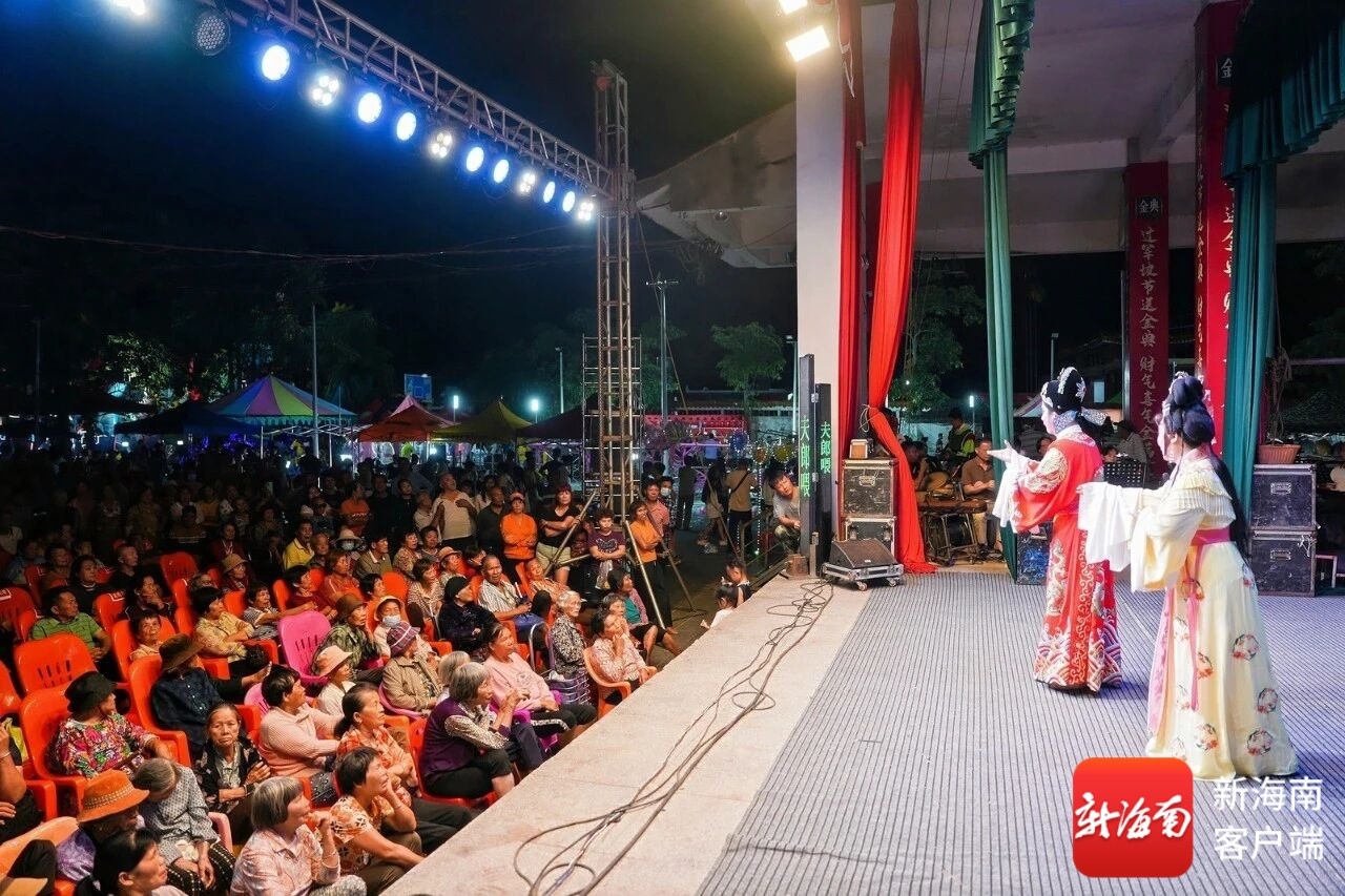 当晚,作为文化节重要内容之一的琼剧演出《忠孝富贵家》在新坡村戏台开唱,传统唱腔与本土故事相得益彰,吸引周边村民与游客驻足聆听。