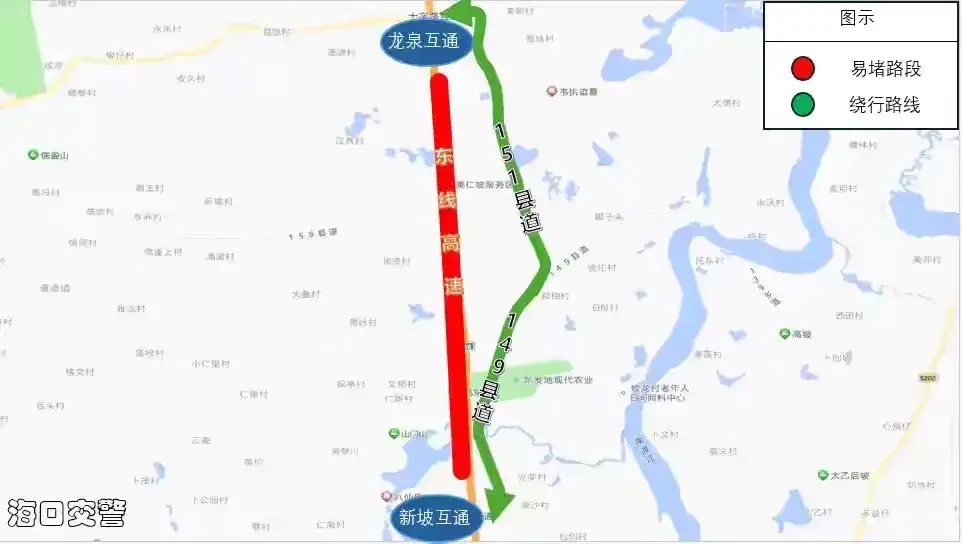 拥堵绕行:如东线高速龙泉互通至新坡互通车流量大,建议途经车辆绕行151县道⇆149县道。