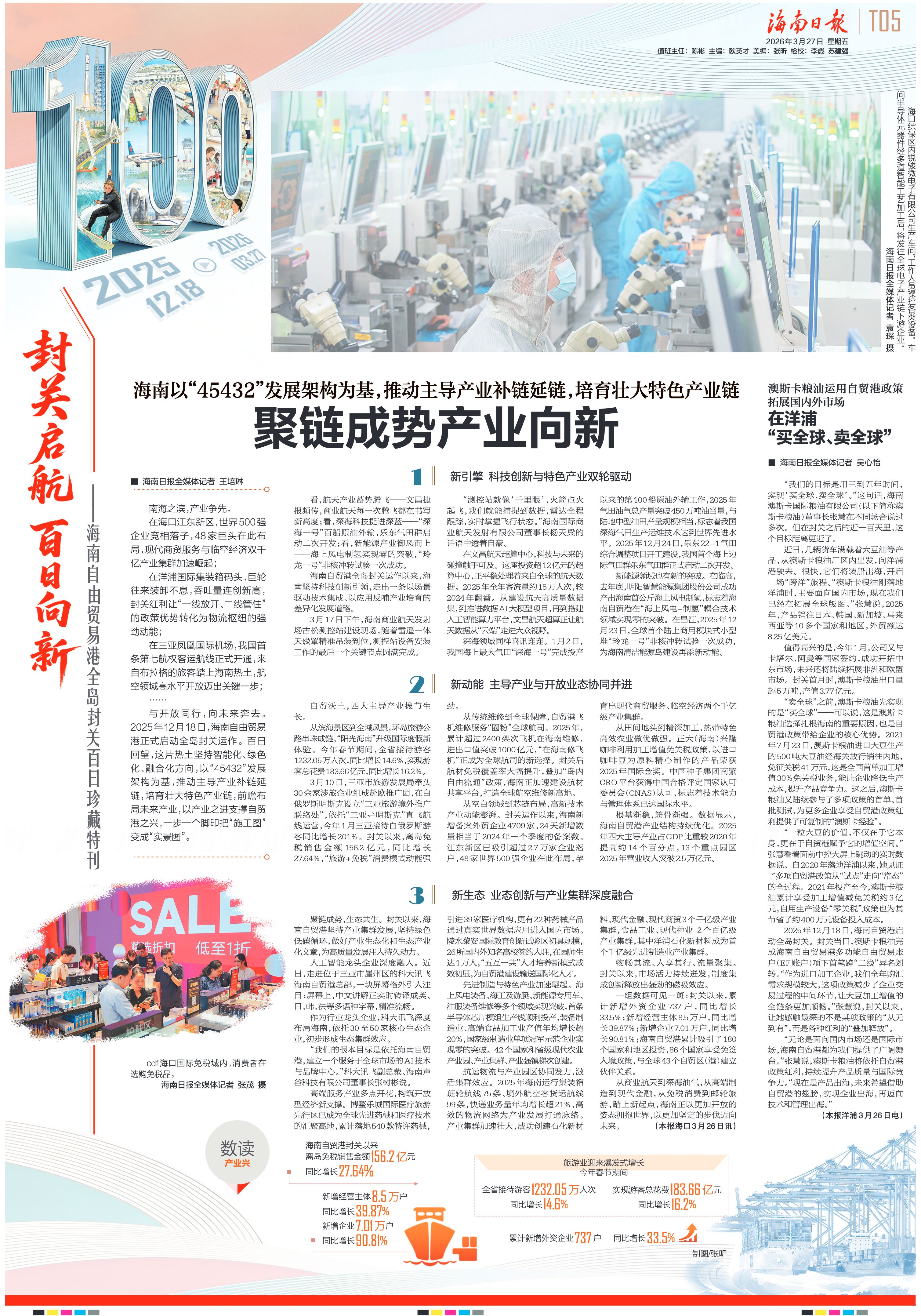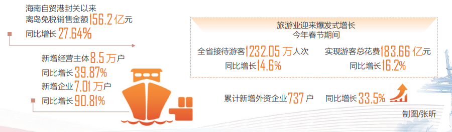 与开放同行,向未来奔去。2025年12月18日,海南自由贸易港正式启动全岛封关运作。百日回望,这片热土坚持智能化、绿色化、融合化方向,以“45432”发展架构为基,推动主导产业补链延链,培育壮大特色产业链,前瞻布局未来产业,以产业之进支撑自贸港之兴,一步一个脚印把“施工图”变成“实景图”。