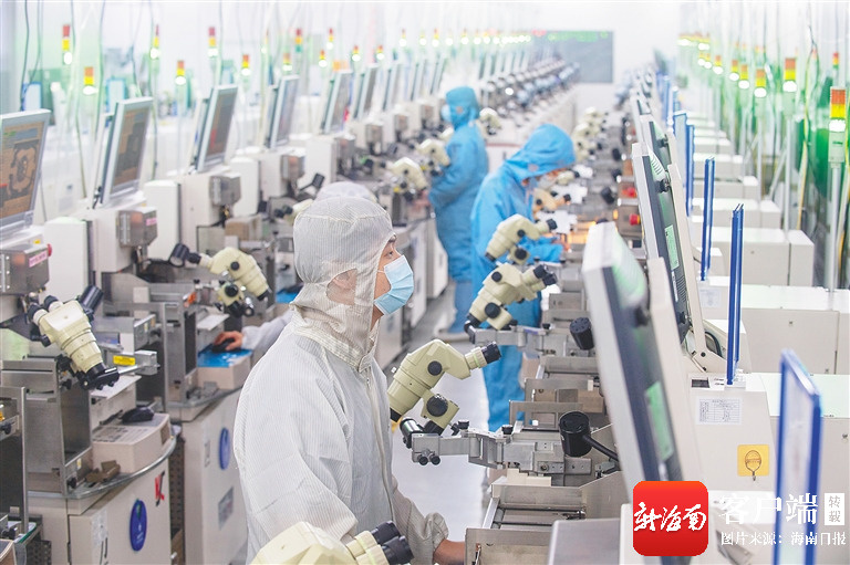 海口综保区内锐骏微电子有限公司生产车间,工作人员操控各类设备。车间半导体元器件经多道智能工艺加工后,将发往全球电子产业链下游企业。海南日报全媒体记者袁琛 摄