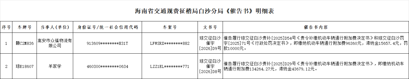 依据《中华人民共和国行政强制法》第五十四条之规定,本单位已向下列当事人作出《催告书》,但因采取其他方式无法向下列当事人送达《催告书》,根据《中华人民共和国民事诉讼法》第九十五条的规定,本单位特依法进行公告送达,自公告之日起经过30日即视为送达。请下列当事人自《催告书》送达之日起十一日内履行义务,履行方式:应到海南省白沙黎族自治县牙叉镇牙叉中路330号(海南省交通规费征稽局白沙分局)处开具《海南省非税收入一般缴款书》,并按《海南省非税收入一般缴款书》要求进行缴款。逾期仍未履行义务的,本单位将依法向白沙县人民法院申请强制执行。你(单位)可在本催告书送达之日起五日内向本机关进行陈述、申辩;逾期不陈述、申辩的,视为放弃陈述、申辩的权利。