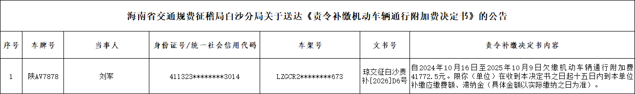 请下列当事人自《责令补缴机动车辆通行附加费决定书》送达之日起十五日内履行义务,履行方式:应到海南省白沙黎族自治县牙叉镇牙叉中路330号(海南省交通规费征稽局白沙分局)处开具《海南省非税收入一般缴款书》,并按《海南省非税收入一般缴款书》要求进行缴款。