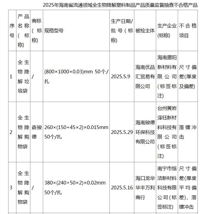 海南省市场监督管理局表示,抽查发现的不合格全生物降解塑料制品产品,移交被抽检生产单位所在地市场监管部门依法进行处理。