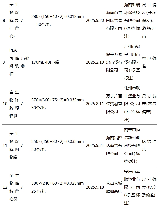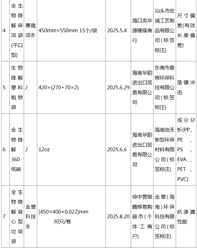 海南省抽检全生物降解塑料制品 12批次产品不合格