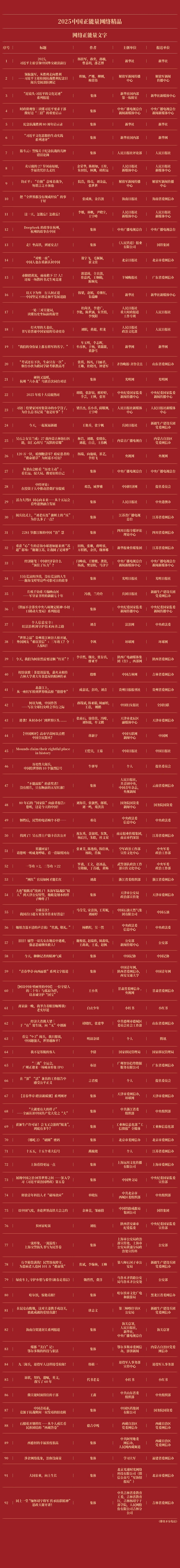 3月29日,由中央网信办主办的2025中国正能量网络精品征集展播活动正式揭晓结果,海南日报报业集团选送的三件作品成功入选中国正能量网络精品。其中,《把“全世界都没有现成经验”的事干好》入选网络正能量文字;《荣光·老兵故事》入选网络正能量图片;《海南自贸港:封关启航 开放新篇》入选网络正能量专题专栏。