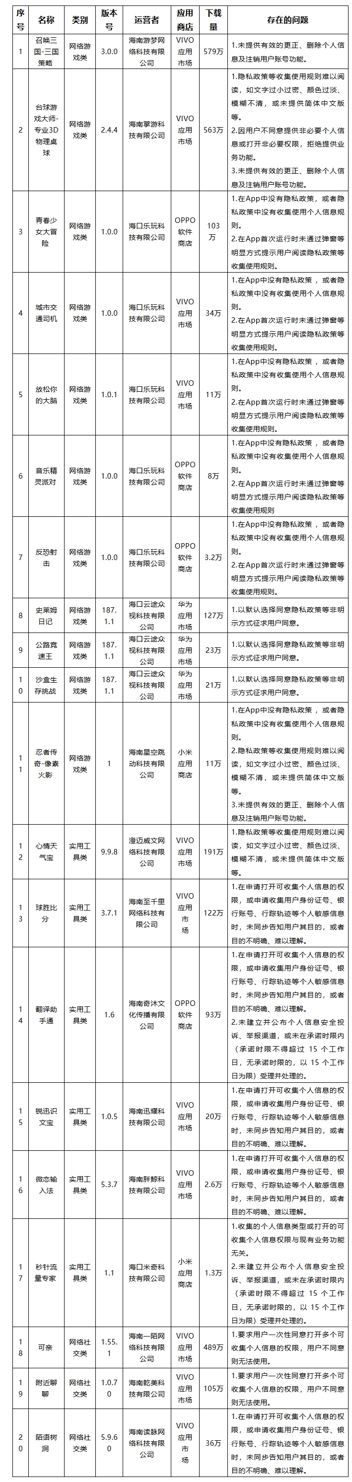 为深入推进海南省个人信息保护领域专项治理工作,近期,针对群众反映强烈的移动应用程序(包含App、小程序等)非法获取、超范围收集、过度索取权限等侵害公民个人信息的违法违规现象,海南省互联网信息办公室依据《中华人民共和国网络安全法》《中华人民共和国个人信息保护法》《App违法违规收集使用个人信息行为认定方法》《常见类型移动互联网应用程序必要个人信息范围规定》等法律和有关规定,组织对省内用户量大的移动应用程序收集使用个人信息情况进行了技术检测,检测结果显示“召唤三国-三国策略 ”“台球游戏大师-专业3D物理桌球”“青春少女大冒险”等20款移动应用程序均存在不同程度违法违规收集使用个人信息的行为,现将有关情况通报如下: