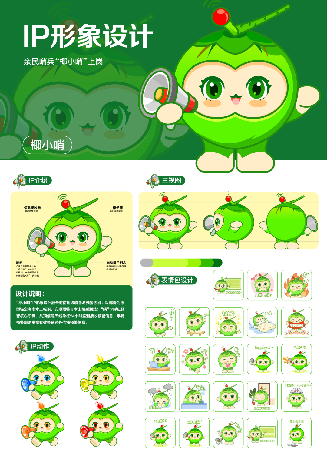 融合本土特色与核心职能的新设计。椰小哨名称中“椰”字锚定海南本土标识,既关联象征坚韧生命力的椰树,也对应原型椰青的鲜活灵动,二者相融传承了“扎根守土、坚韧不拔、无私奉献”的椰树精神,让防灾预警与本土情感自然联结;“哨”取“哨兵”之意,精准对应中心“提前预警、保障安全”的核心职责。形象上,头顶信号天线象征24小时不间断接收多元预警信息,及时洞察风险;手持预警喇叭寓意第一时间将专业信息转化为群众听得懂、用得上的避险指引,切实打通灾害预警“最后一公里”。
