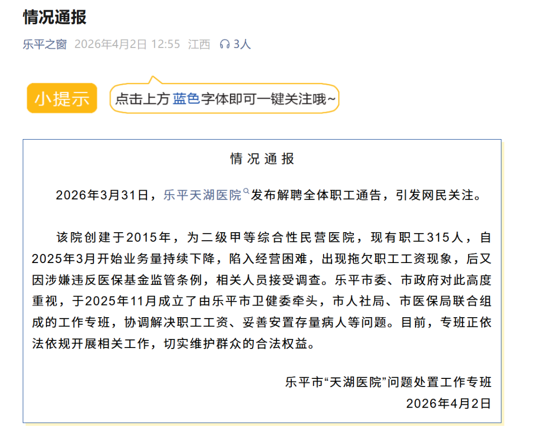 3月31日,乐平天湖医院发布解聘全体职工通告,引发网民关注。