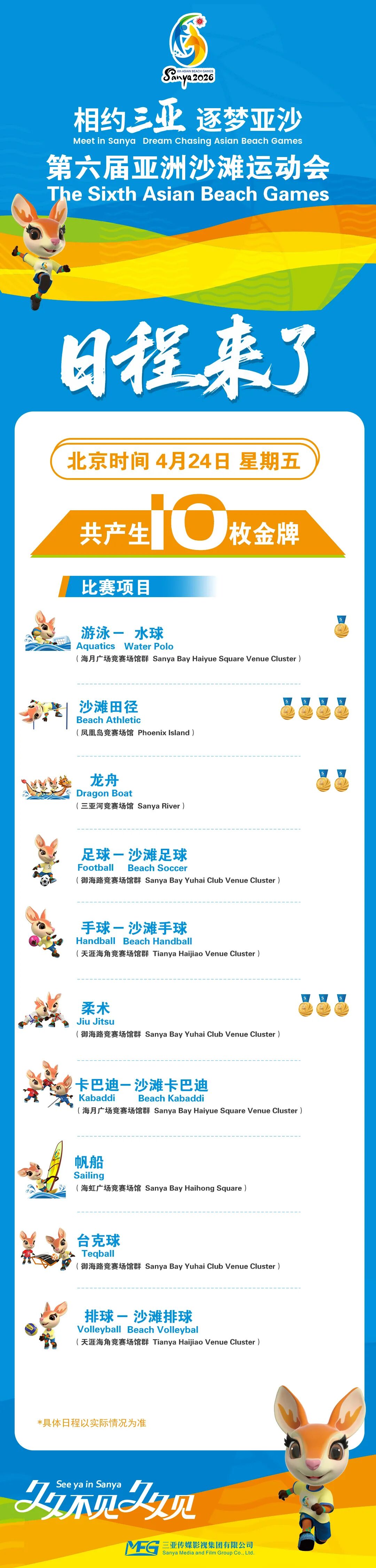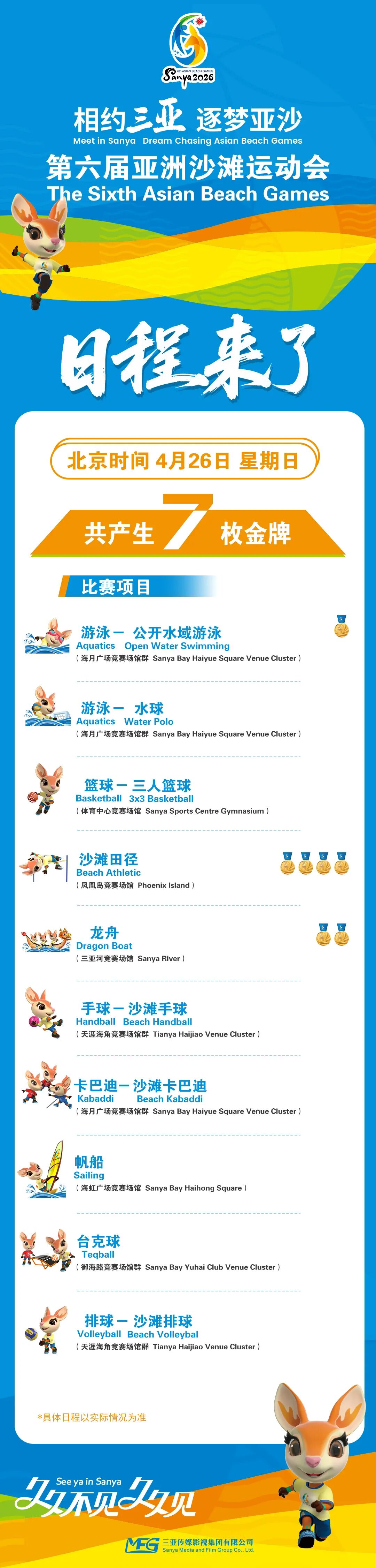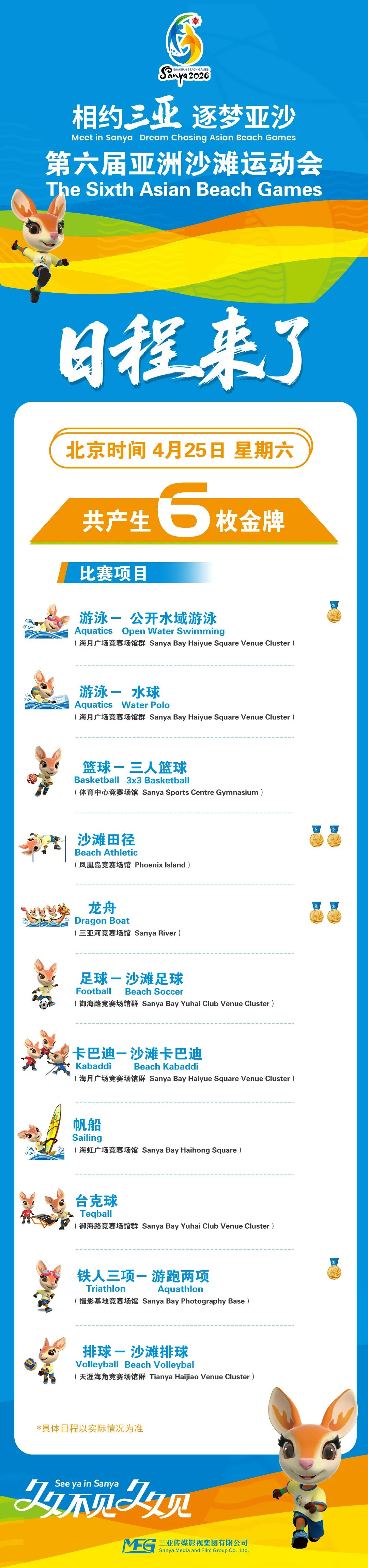 第六届亚洲沙滩运动会将于2026年4月22日至30日在海南三亚举行,本届赛事共设14个大项、15个分项、62个小项,将产生62枚金牌,其中沙滩田径、沙滩摔跤、帆船、龙舟、柔术等项目,是产生金牌较多的重点大项。具体赛程如下↓