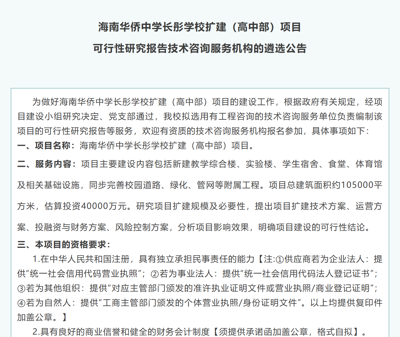 南海网、新海南客户端4月8日消息(记者 徐智慧)备受关注的海口市长流片区教育资源升级尘埃落定。记者获悉,海南华侨中学长彤学校高中部扩建项目已正式进入实质性推进阶段。该项目于2026年4月7日发布可行性研究报告技术咨询服务机构的遴选公告,标志着这所九年一贯制学校即将开启高中办学的新篇章。