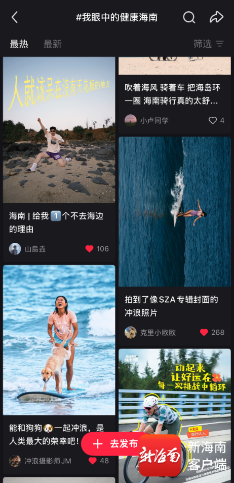 这些作品各具特色,又富有生活气息。比如,投稿者“是孙十二啊”晒出自己拍摄的居民在安静公园内晨练的美图,富有动感与感染力;投稿者“Ee.”晒出自己在海边骑行道迎海风观海涛慢骑行的“醉美”画面,一边运动一边享受海南美景,作品更是得到上千的点赞。