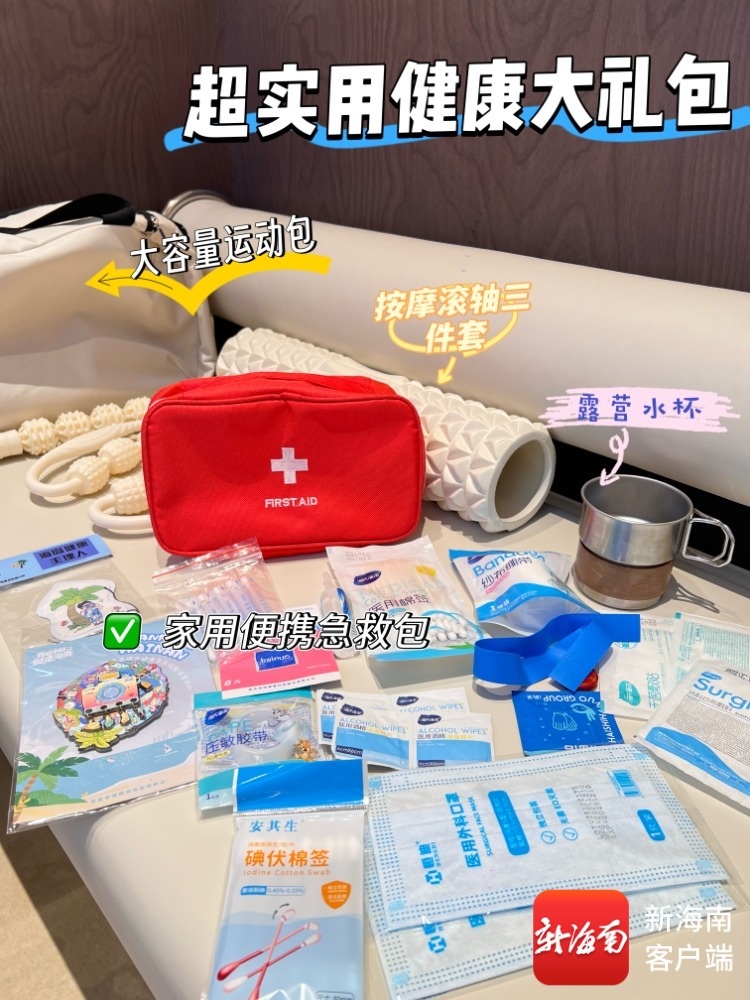 参加投稿的网友,有机会赢取活动方准备的精美实用礼包。除了专属定制的冰箱贴,还有超级实用的健康大礼包,内有超大容量的运动包、按摩滚轴三件套、家用便携急救包、露营水杯、海岛健康主理人专属卡片等。
