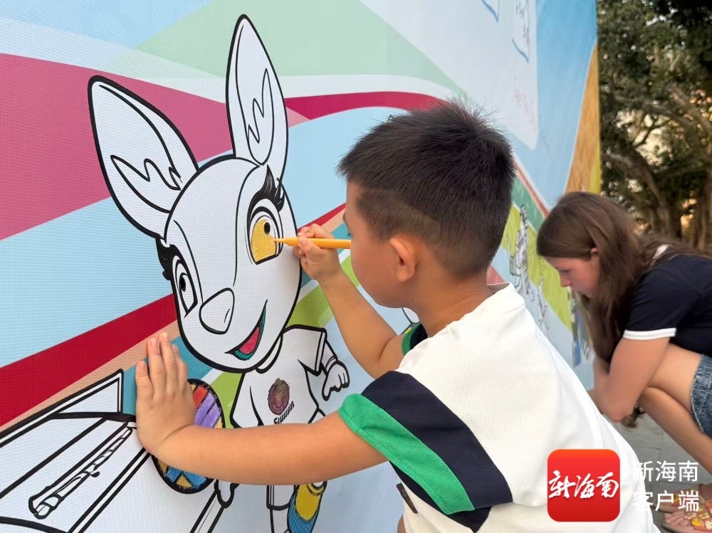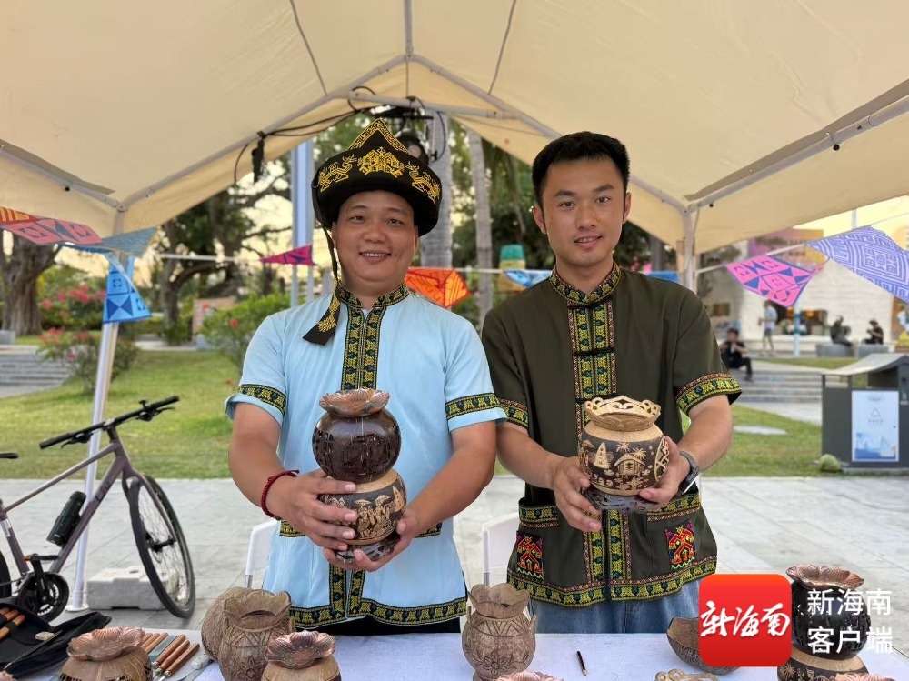 除了视听盛宴,丰富的互动体验让游客玩得尽兴。沙滩两人三足“运椰赛”、椰壳保龄球、套椰英雄等趣味项目前排起长队,选手们在沙滩上尽情角逐,获胜者收获黎锦挂件、黎苗小摆件等特色奖品;“黎乡风物”非遗体验区内,漆扇绘制、黎陶制作、椰雕展示等活动吸引众人驻足,孩子们在手臂印上传统纹样,让非遗在互动中悄然传承。