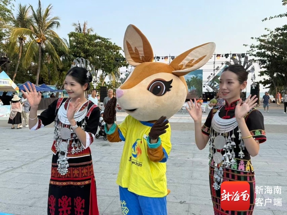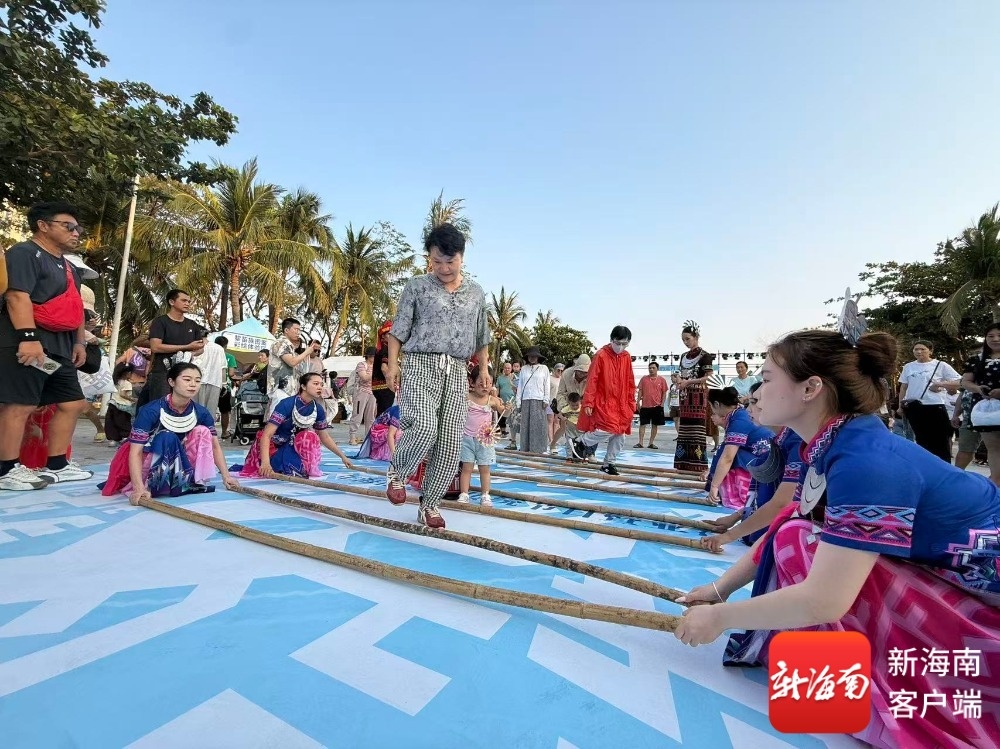 活动现场,大东海沙滩化作充满活力的露天派对。“奔内热”表演点燃全场氛围,身着盛装的黎族同胞手持锣鼓、牛角号,与“亚亚”一同走向人群,邀请游客手拉手围成圆圈载歌载舞。一旁,民族DJ与竹竿舞节奏混搭的电子乐持续奏响,古老旋律与潮流节拍同频共振,掀起一波又一波互动热潮,不少游客举着手机记录下这独特的狂欢瞬间。