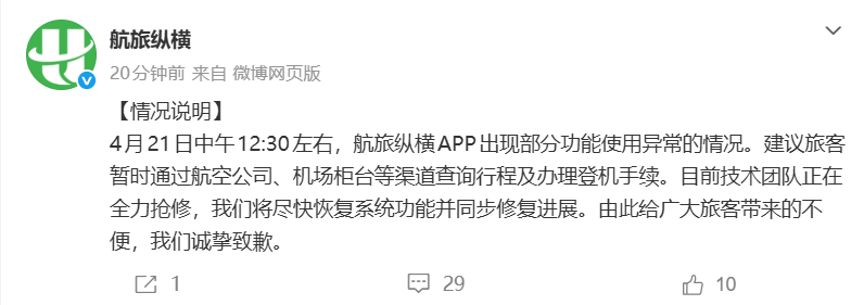 4月21日,航旅纵横微博发布情况说明。全文如下: