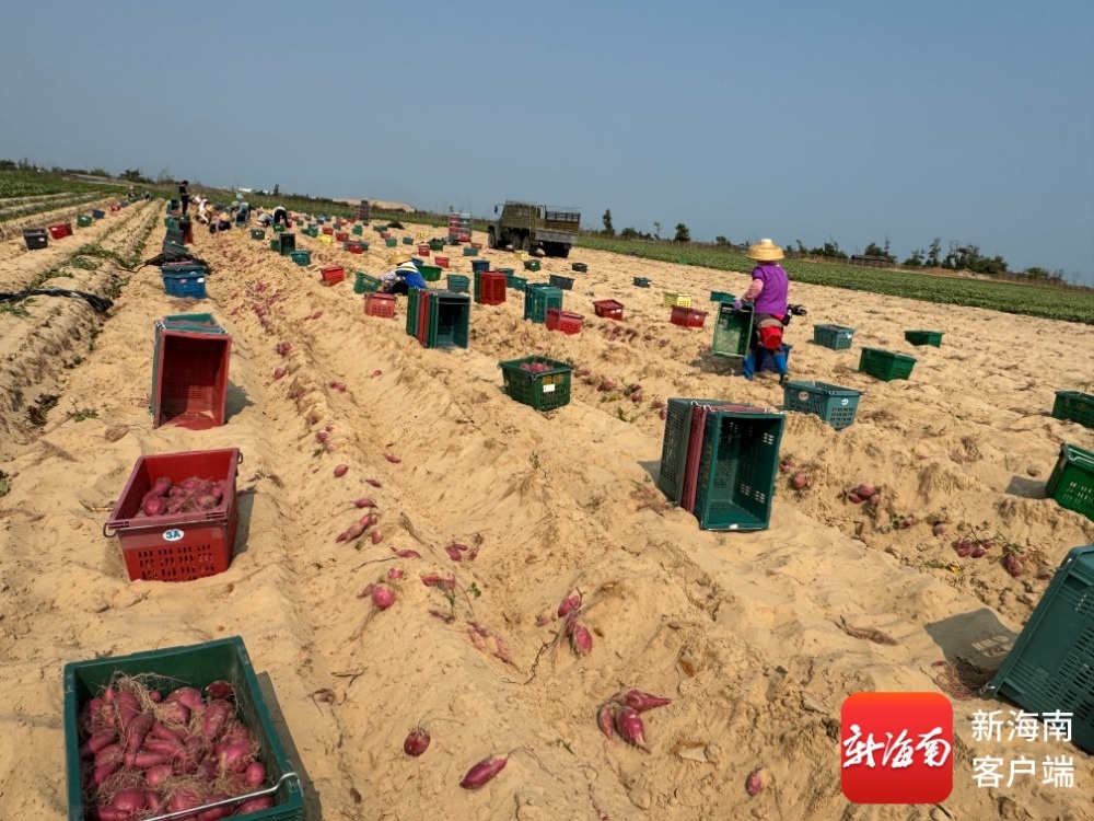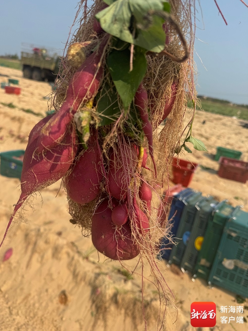 走进海南文昌铺前镇木兰湾一片地瓜种植基地,空气中弥漫着番薯的清香,只见铲车在地瓜地里犁过,一颗颗果型饱满,色泽亮丽的番薯便顺着瓜藤,从海沙中被带出来,在一旁的工人们双手翻飞,将这些新鲜的番薯打包装筐。这些番薯经过清洗分级挑选打包后,很快将发往国内各大城市。