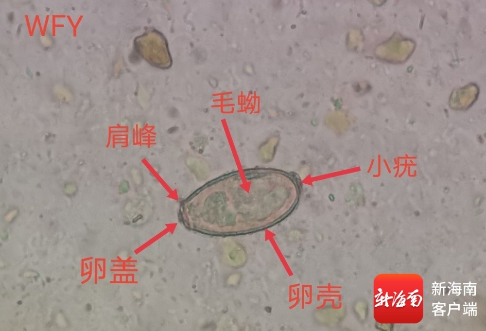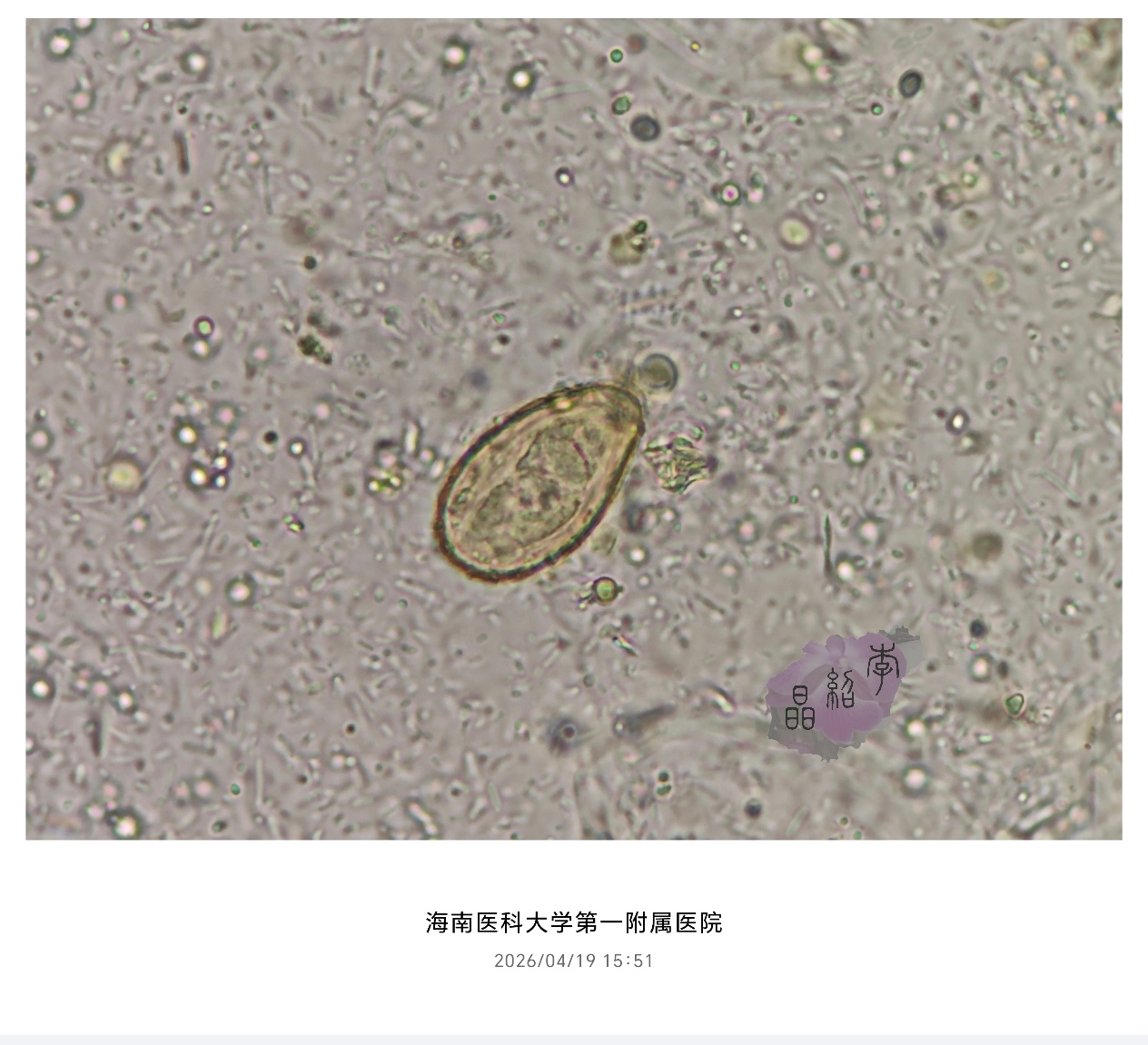 功夫不负有心人,半小时过后,她终于在显微镜下看到了那个“预想中”的虫卵:它状如芝麻,微小(27~35×12~20 μm),前端窄,有卵盖,盖周增厚成肩峰;后端钝圆,有小疣(小突起);有厚卵壳,内有成熟毛蚴。此时,李绍晶如释重负,马上掏出手机拍图发给了谭琰主任。这是一个毛蚴发育成熟的虫卵,此时的虫卵数量还非常少,她在样本中只找到了两粒。这种寄生虫感染在海南还是非常少见,也鲜有人生吃淡水鱼片。