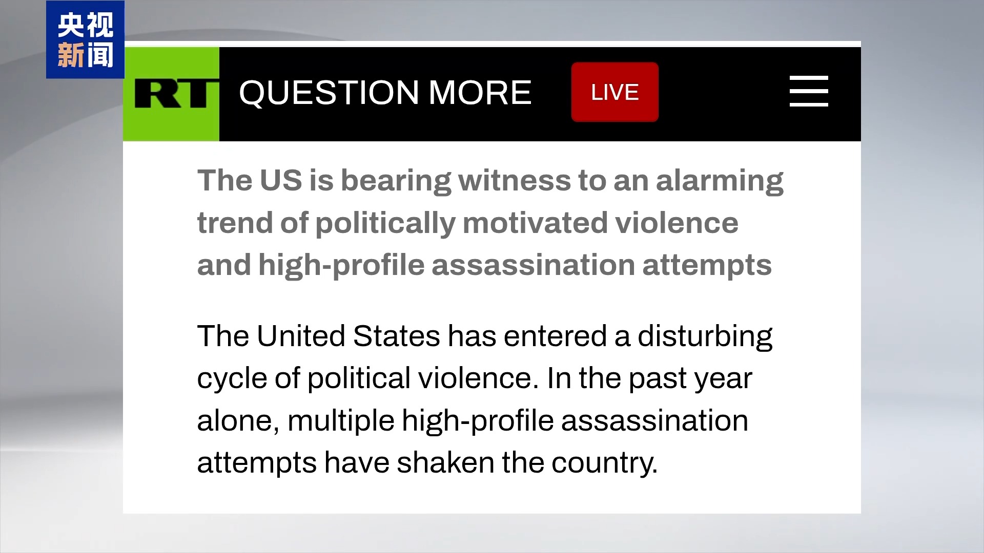 据今日俄罗斯电视台9月11日报道,包括10日查理·柯克遭枪击死亡在内,美国在最近一年多时间内接连发生多起针对政治人物的暗杀事件。