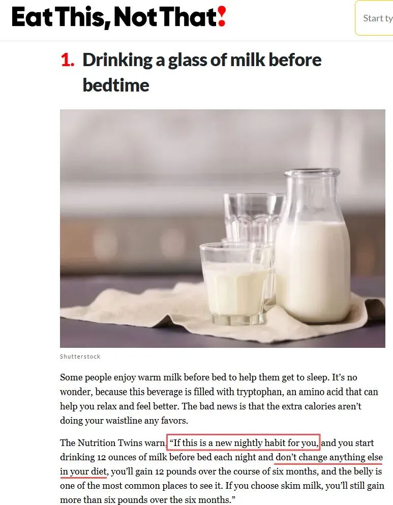 这段话出自美国《吃这个,不吃那个!》(Eat This,Not That!)杂志,其中虽然提到“夜间喝牛奶的习惯,会暗中增加腹部脂肪”,但这里明确指出的是:如果将睡前喝牛奶作为新的夜间习惯,才会增加体重。当你开始每晚睡前喝 12 盎司(约 354 毫升)牛奶,并且不改变饮食中的任何其他东西,那么你会在 6 个月内增加 12 磅(10.89 斤),而腹部是最常见的部位之一。如果你选择脱脂牛奶,你仍然会在六个月内增加 6 磅(4.44 斤)以上。[1]