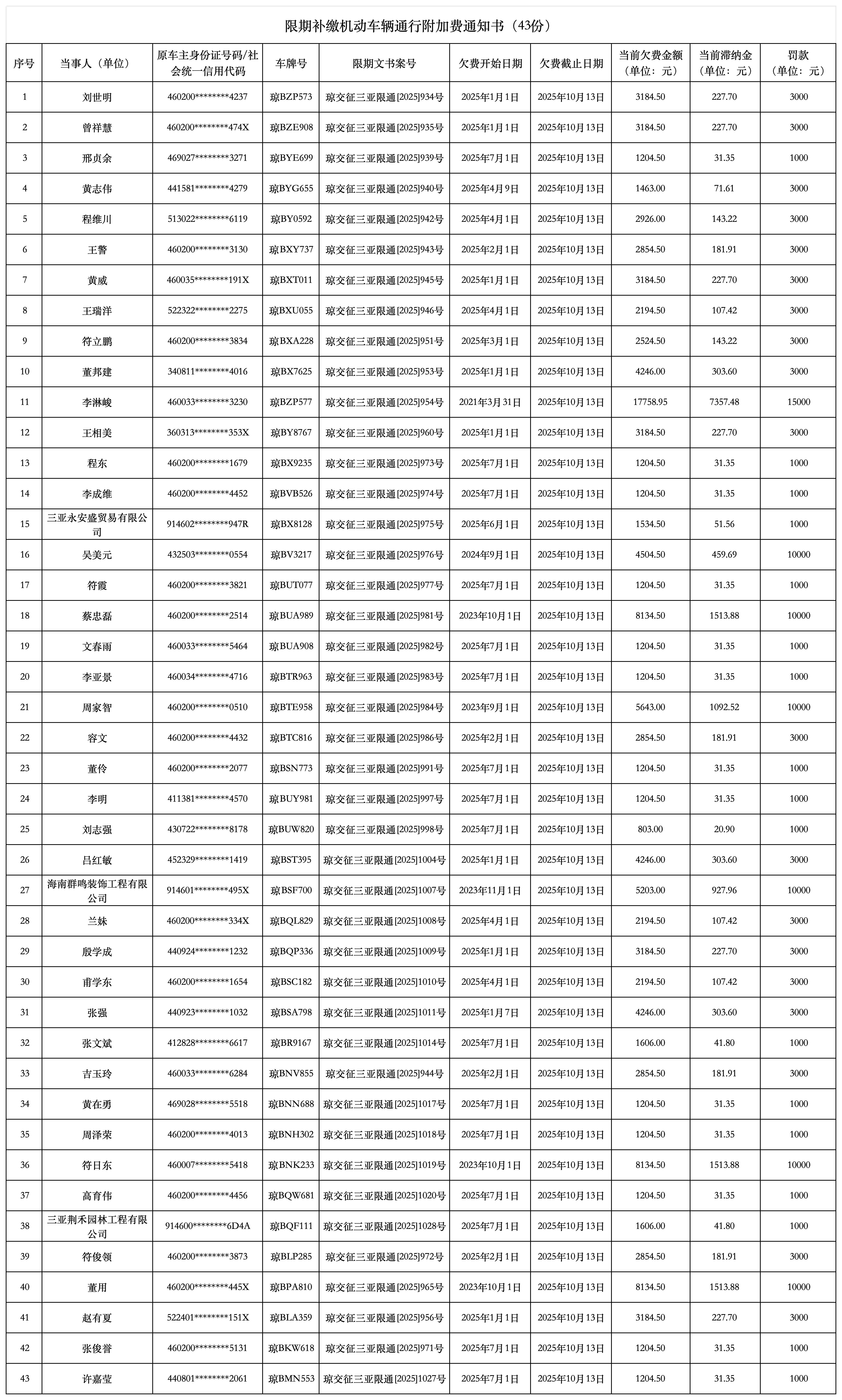 如你(单位)对本机关提供的上述欠费信息无异议,根据《海南经济特区机动车辆通行附加费征收管理条例》第九条、第二十六条的规定,限你(单位)在本公告送达之日起15个工作日内到海南省三亚市吉阳区凤凰路123号(海南省交通规费征稽局三亚分局)处开具《海南省非税收入一般缴款书》,并按《海南省非税收入一般缴款书》要求进行缴款(应缴规费、滞纳金两项具体金额以实际缴纳之日为准)。