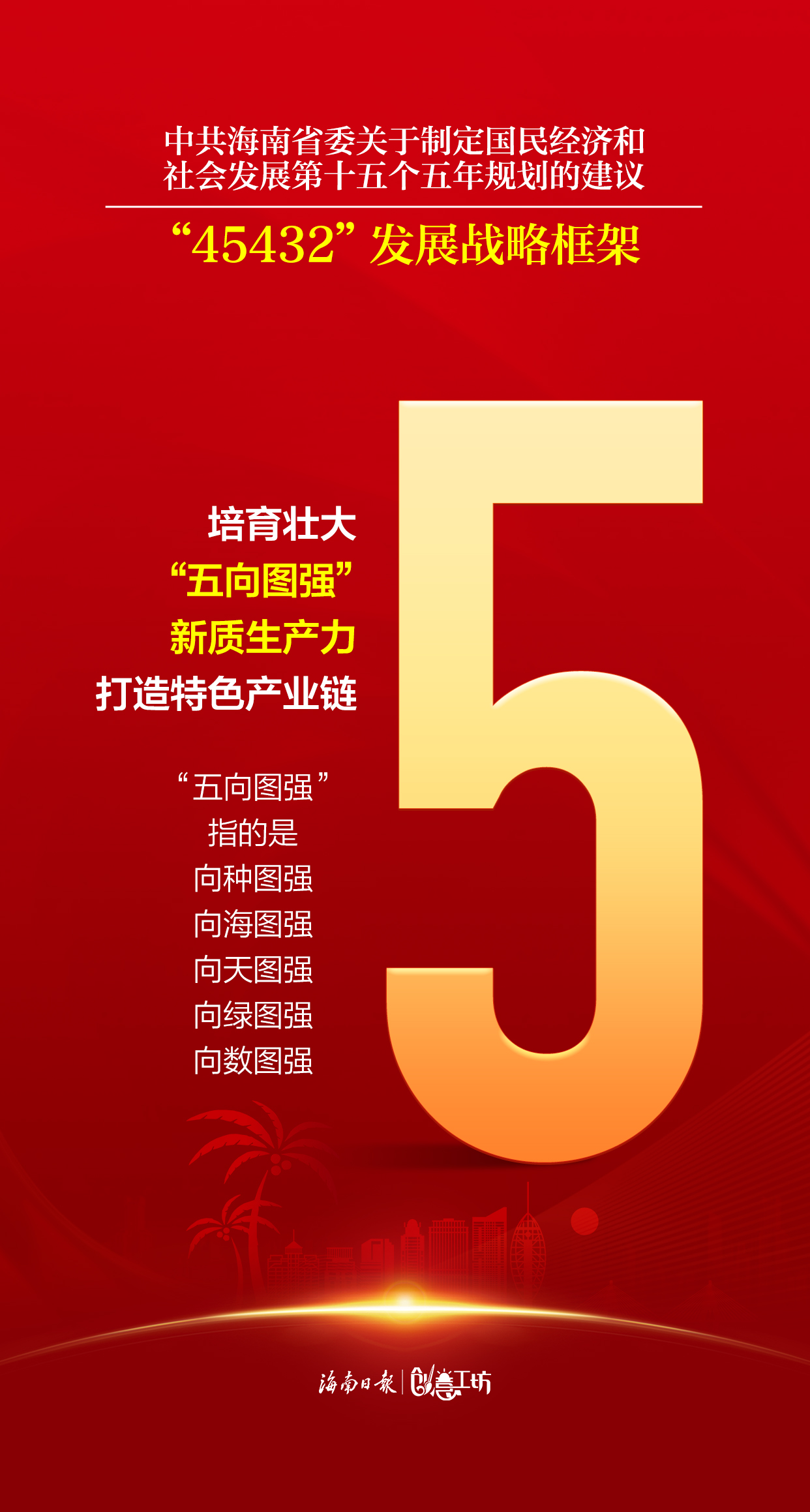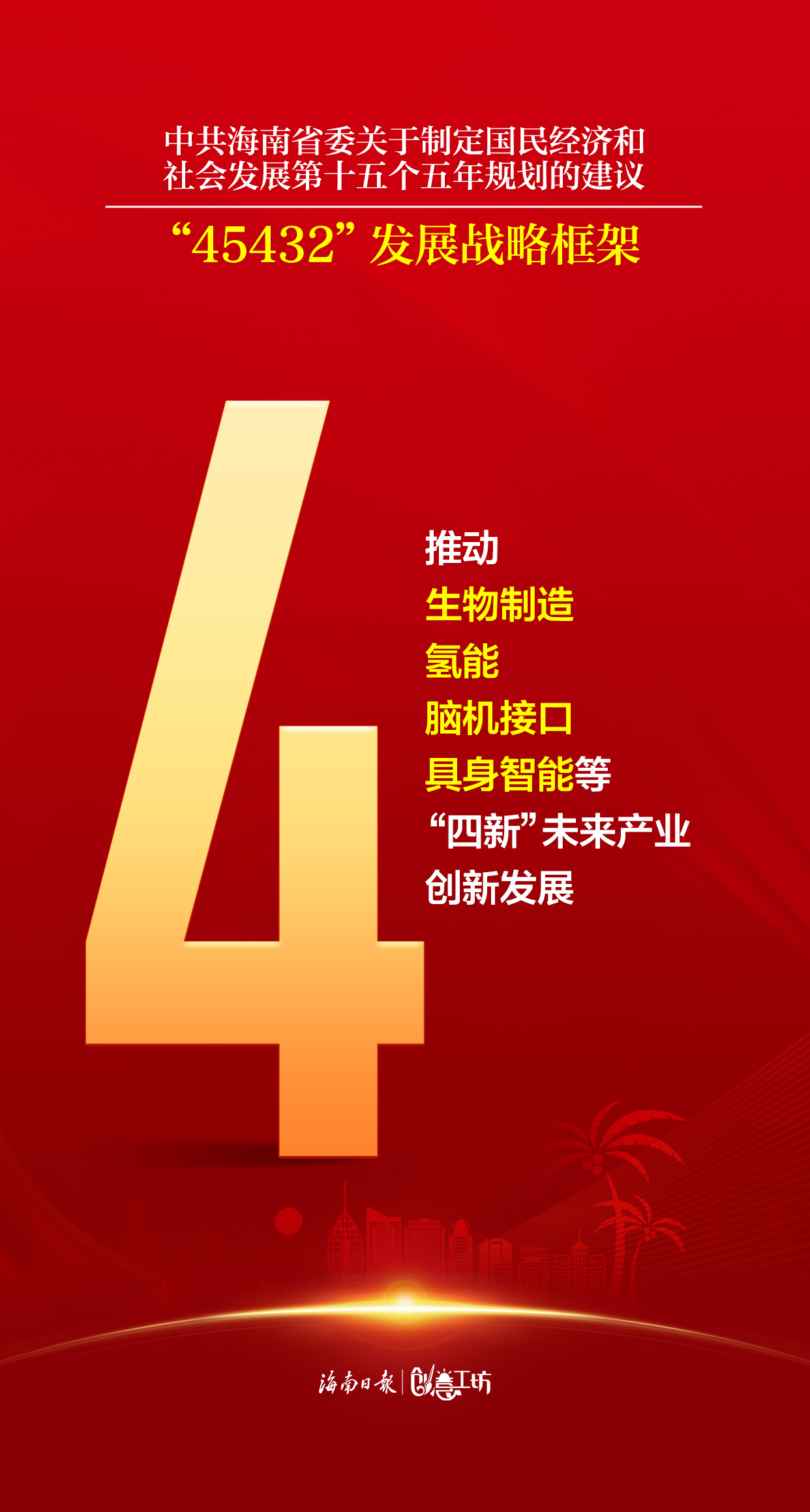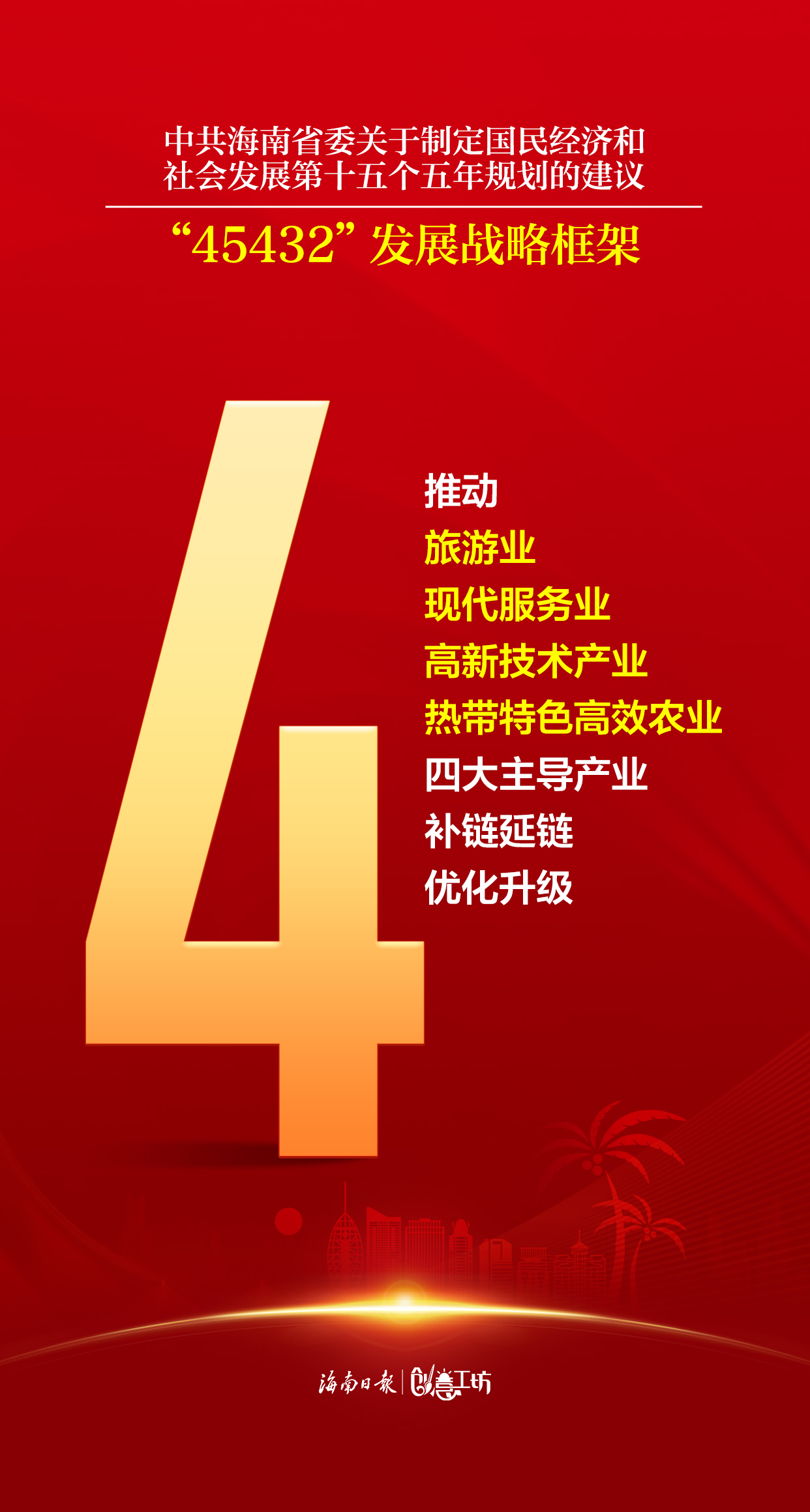 《建议》聚焦推动高质量发展,提出“45432”的发展战略框架,推动构建具有海南特色和优势、梯次布局的现代化产业体系。