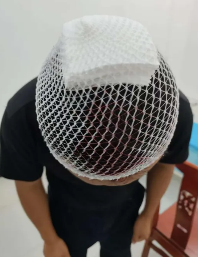 他的头被包扎了起来