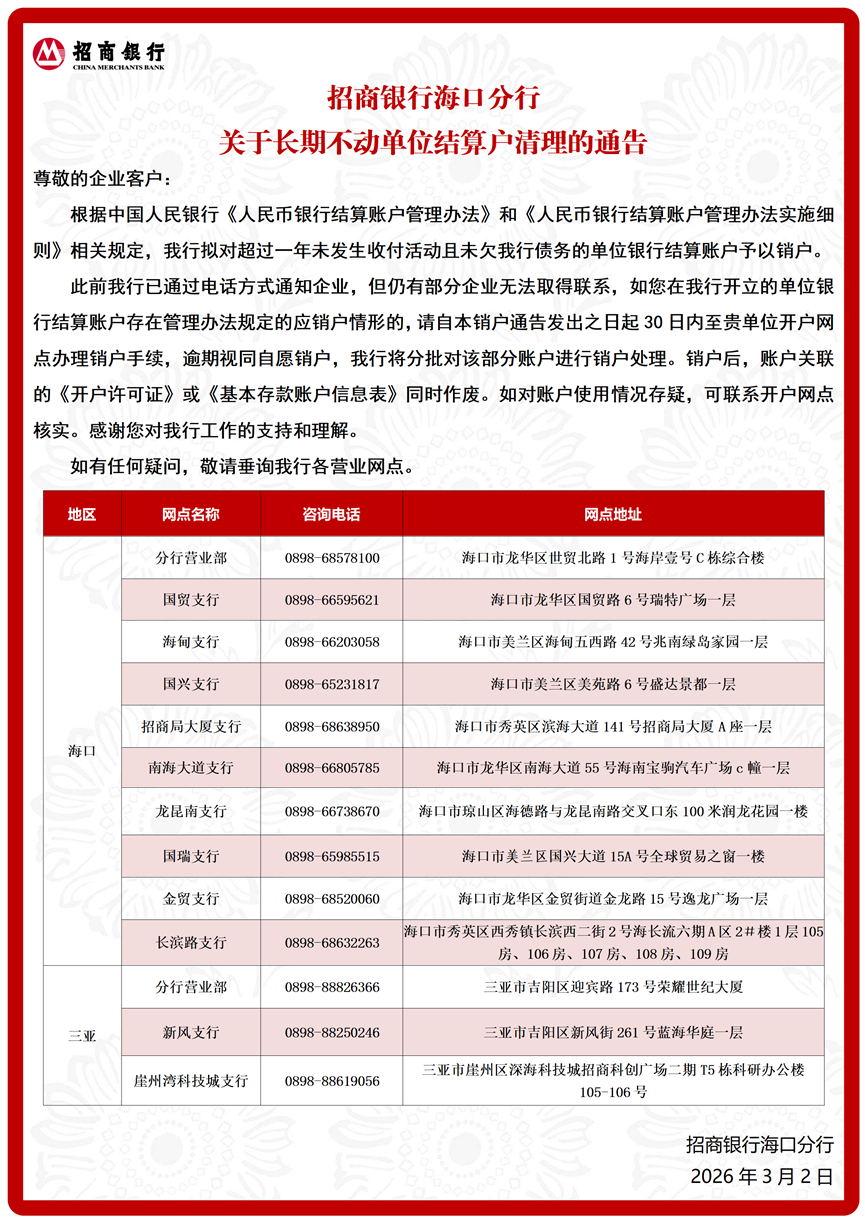 此前我行已通过电话方式通知企业,但仍有部分企业无法取得联系,如您在我行开立的单位银行结算账户存在管理办法规定的应销户情形的,请自本销户通告发出之日起30日内至贵单位开户网点办理销户手续,逾期视同自愿销户,我行将分批对该部分账户进行销户处理。销户后,账户关联的《开户许可证》或《基本存款账户信息表》同时作废。如对账户使用情况存疑,可联系开户网点核实。感谢您对我行工作的支持和理解。